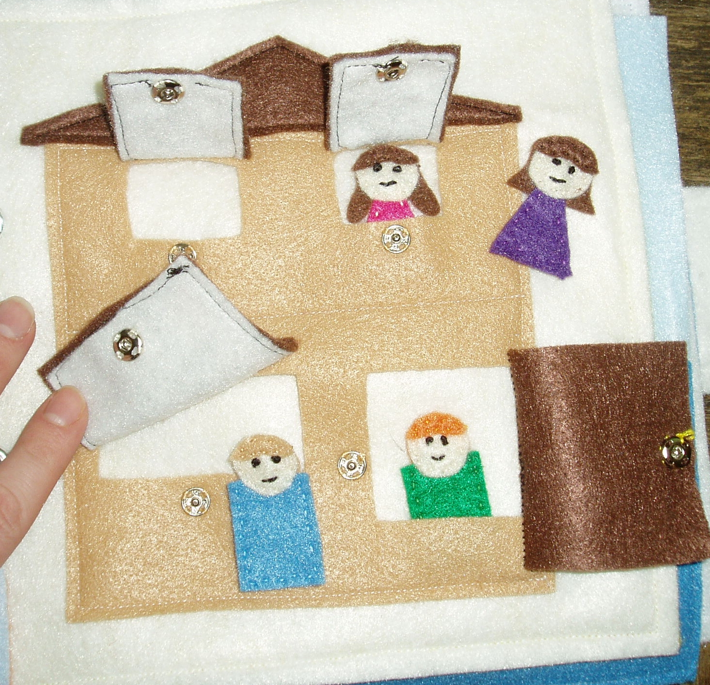 This free quiet book patterns page is also customized to look like our family. Evan loves to pull the little people out and play with them. Each of the flaps close with snaps to practice those fine motor skills. Get the free quiet book template here.