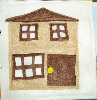 The holes that you cut in the main part of the house should be smaller than the window or door covering it. That way, you have room to sew on the window or door as well as the snap to close it. I used sew-on snaps, which were kind of hard for my three-year old’s hands to manage. Maybe you can find something easier? I also sewed a line through the middle of the house, under the windows, to keep the people from sliding down.